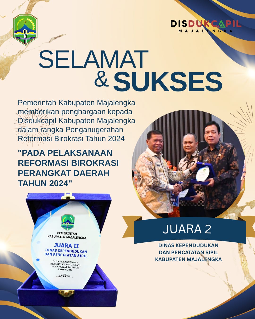 Selamat atas diraihnya Juara 2 Pelaksanaan Reformasi Birokrasi Tingkat Kab.Majalengka Tahun 2024 Admin Disduk Octobar 02,2025 Berita 21 Dilihat
