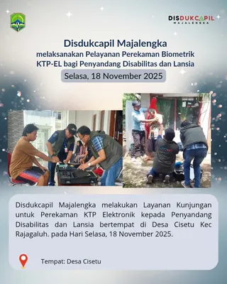 Disdukcapil Majalengka melakukan Layanan Kunjungan untuk Perekaman KTP Elektronik kepada Penyandang Disabilitas dan Lansia bertempat di Desa Cisetu Kec Rajagaluh. pada Hari Selasa, 18 November 2025.