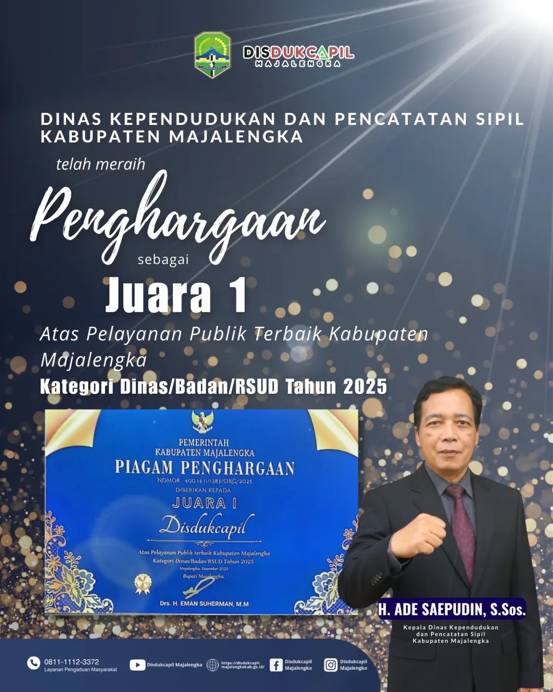 Disduk Capil Kabupaten Majalengka Meraih Penghargaan Juara 1 Atas Penghargaan Pelayanan Terbaik Admin Disduk January 09,2026 Berita 11 Dilihat