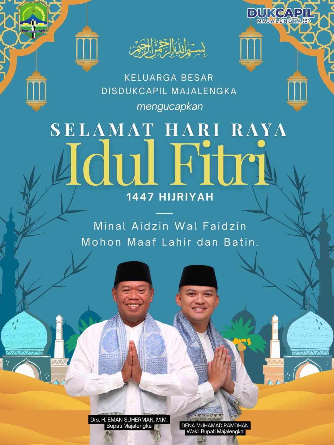 Keluarga Besar Disdukcapil Majalengka mengucapkan selamat Hari Raya Idulfitri 1447 Hijriah. Minal 'a Admin Disduk March 27,2026 Berita 6 Dilihat