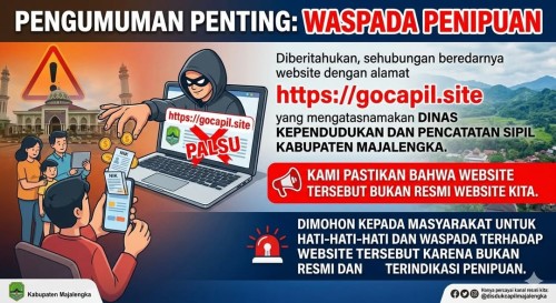 Telah beredar situs web dengan alamat https://gocapil.site yang mengatasnamakan Dinas Kependudukan dan Pencatatan Sipil Kabupaten Majalengka.